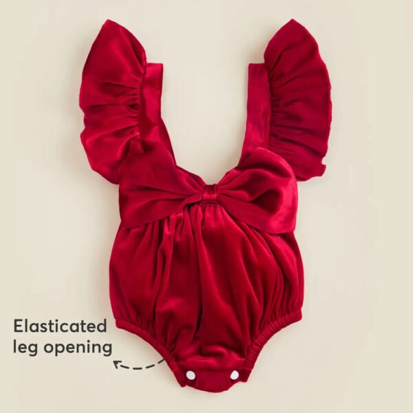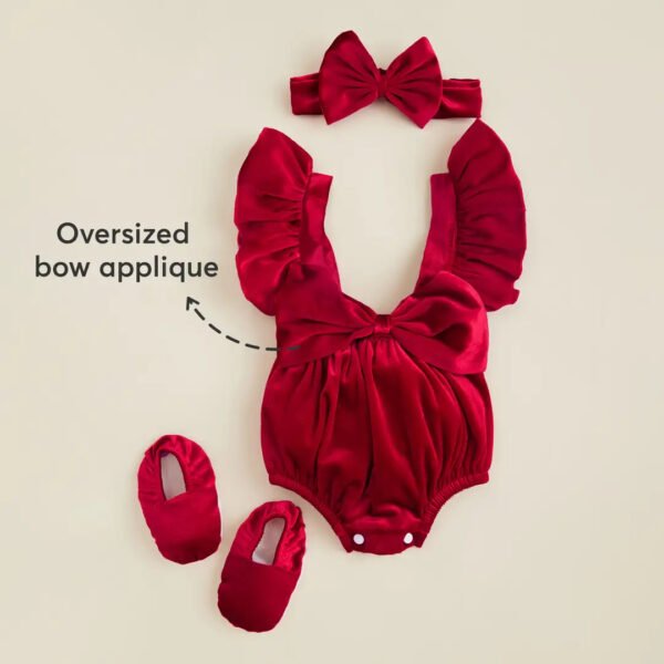 - A luxurious red satin baby onesie featuring an oversized bow applique, paired with matching headband and booties for a complete festive outfit perfect for special occasions.